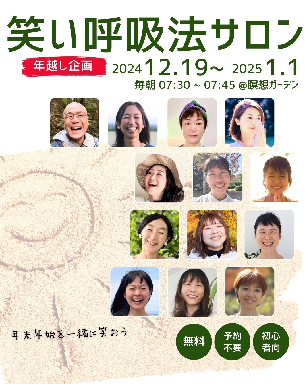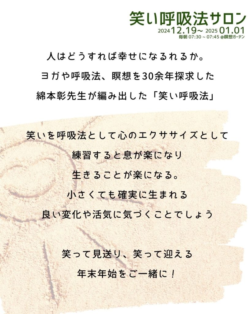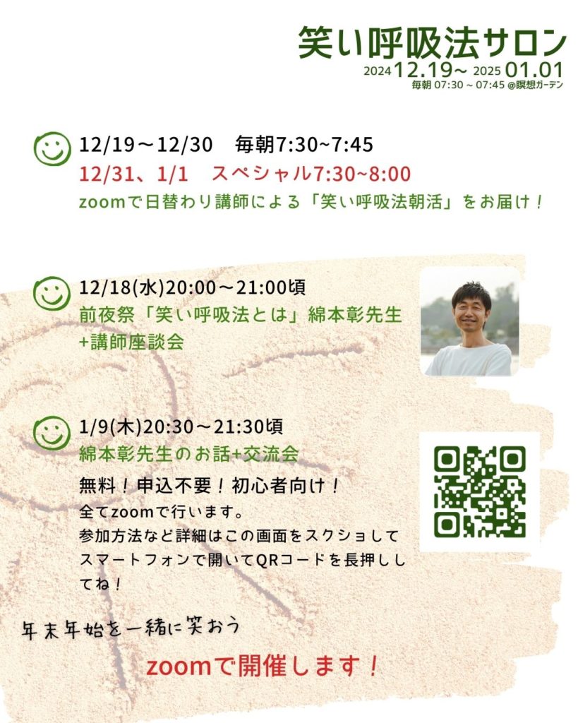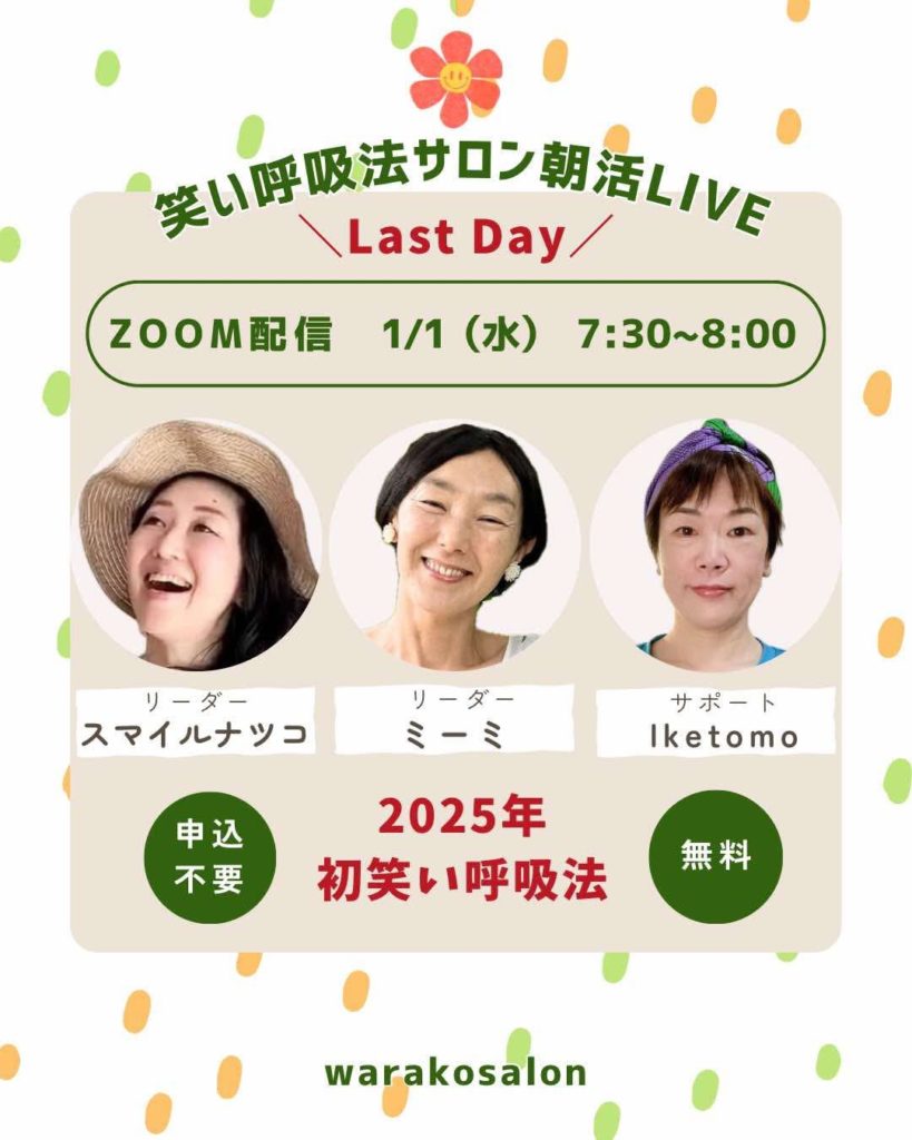 朝7時30分から30分間、私も新年の抱負を考えるワークと笑い呼吸法を担当しますので、よかったらご参加くださいね。
